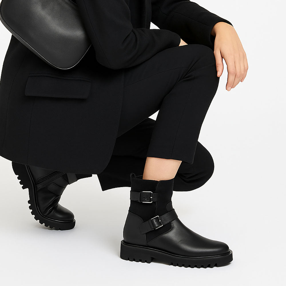 Stivaletti da donna realizzati in morbida pelle di vitello nappa e pelle scamosciata di vitello, con una calda e confortevole fodera in pelle di pecora per un comfort e un calore eccezionali.